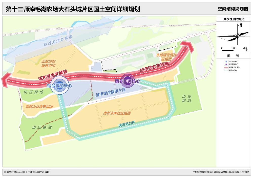 “一环”指沿规划环路,串联行政中心、文化中心、学校、医院、养老中心、兵地融合商业街等公共节点的城市活力环。