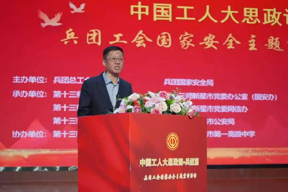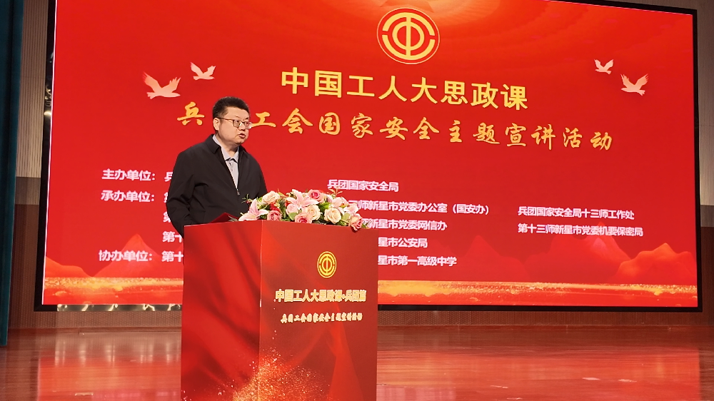4月14日,在第十一个全民国家安全教育日来临之际,由兵团总工会、兵团国家安全局主办的“中国工人大思政课——兵团工会国家安全主题宣讲活动”在第十三师新星市举办。兵团总工会党组书记、主席李江出席并讲话,兵团总工会党组成员、副主席李敏晶,第十三师新星市党委常委、副师长祁昕出席活动,各师市总工会负责同志和300余名一线职工、在校学生参加活动。