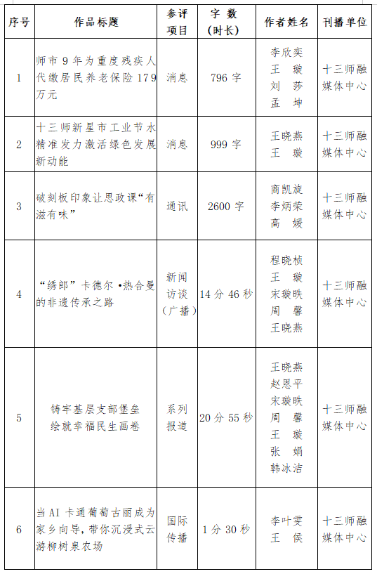 根据新疆记协《关于开展第36届新疆新闻奖评选工作的通知》(新记协发〔2026〕1号)的规定,现对兵团第十三师融媒体中心推荐参加第36届新疆新闻奖作品进行公示,欢迎社会各界监督、评议。公示日期为2026年1月26日至2026年1月30日。