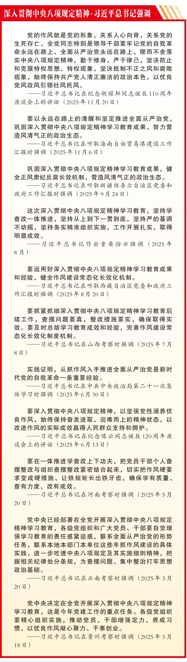 2012年12月4日,中共中央政治局审议通过关于改进工作作风、密切联系群众的八项规定,即中央八项规定,至今已13年。开展深入贯彻中央八项规定精神学习教育,是习近平总书记亲自谋划的今年党建工作重点任务。坚持学查改一体推进,坚持从上到下一贯到底,坚持严的基调不动摇,坚持务实精准组织实施,学习教育扎实开展,取得明显成效。党的十八大以来,以习近平同志为核心的党中央以制定出台中央八项规定开局破题,坚持立铁规矩、强硬约束,坚持以上率下、从中央政治局带头做起,坚持问题导向、聚焦纠治“四风”开展集中教育和一系列专项整治,坚持抓常抓细抓长、一个节点一个节点坚守和推进,坚持党性党风党纪一起抓、正风肃纪反腐相贯通,不仅推动管党治党水平整体提升、为党和国家事业发展凝聚起强大正能量,也为全球政党治理贡献了中国智慧和中国经验。