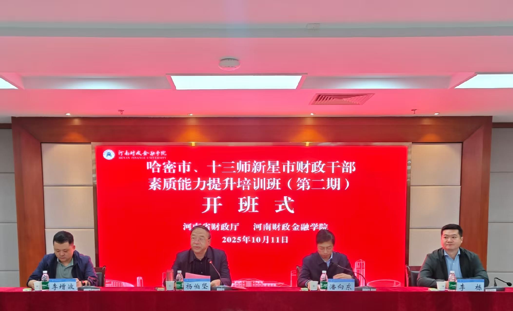 为深化豫哈交流合作,加强财政干部队伍建设,2025年10月11日,由河南省财政厅与河南财政金融学院联合举办的“哈密市、第十三师新星市财政干部素质能力提升培训班(第二期)”开班式在河南财政金融学院隆重举行,此次培训班两地财政系统业务骨干共65人参加培训。