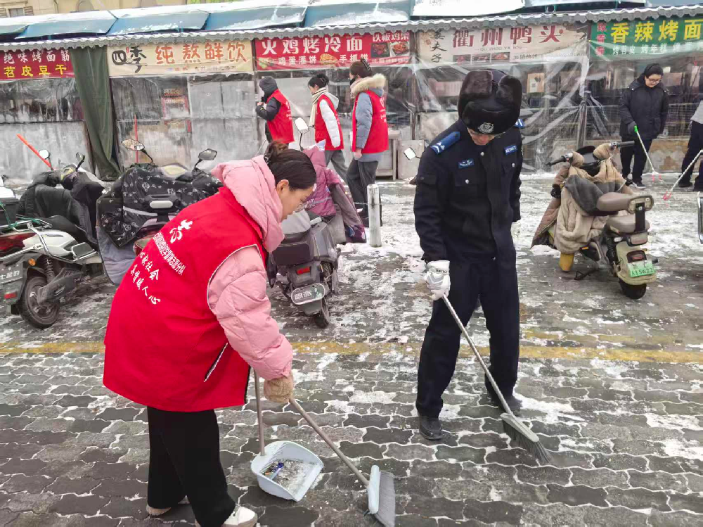 活动现场,大家身着红色志愿服,热情高涨、干劲十足,手持扫帚、铁铲、簸箕等清洁工具,重点对皇后天街及周边区域开展全方位环境卫生整治。针对冬季道路积雪易结冰的问题,大家齐心协力铲除路面积雪、清理积冰,保障职工出行安全;对绿化带、墙角缝隙等卫生死角的垃圾杂物进行细致清扫,不放过任何一处盲区;同时耐心整理沿街商铺外乱堆乱放的物品,引导商户规范经营、自觉维护门前环境。经过一番辛勤劳作,辖区道路变得干净整洁,卫生死角彻底清零,环境面貌焕然一新,赢得了过往职工群众的一致好评。