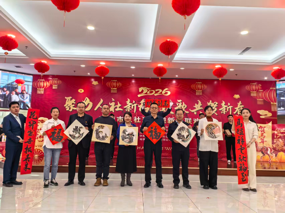 联欢会以文艺联欢为纽带,深化兵地一盘棋、兵地一家亲理念,搭建起兵地人社系统沟通协作、文化交融的平台。活动现场喜气洋洋、氛围热烈,十三师新星市人社局党组成员、副局长陈天庆挥毫泼墨,书写春联与福字,笔墨间饱含新春祝福与美好期许,将吉祥暖意送到在场每一位人社同仁心中。