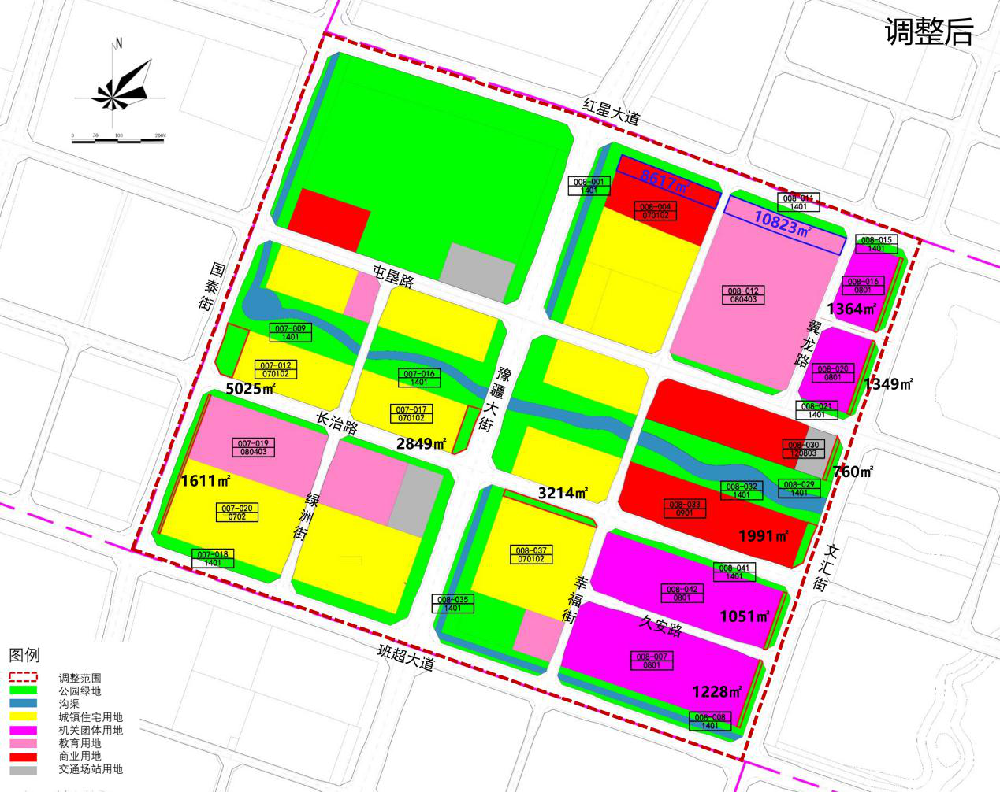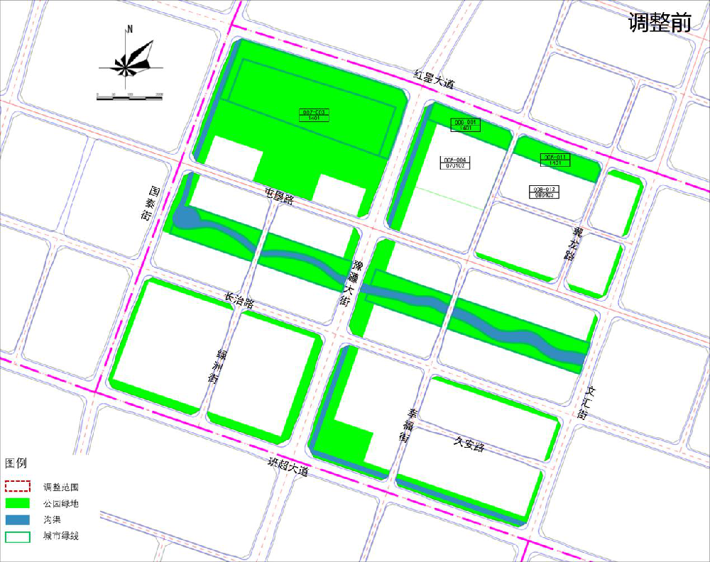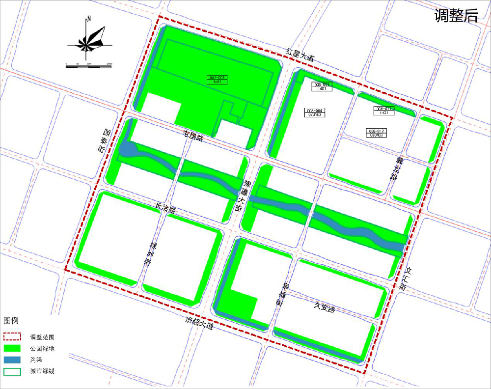 优化黄田老学校、黄田老市场北侧公园绿地绿线布局,优化后绿地绿线与紧邻东侧现状已修建008-015地块绿地绿线宽度20米保持一致;增加007-003、007-004地块绿线面积;豫疆大街007-016地块新增绿地宽度28米,国泰路007-009地块新增绿地宽度48米,将文汇街左侧沿街绿地由12米拓宽至20米。保留黄田老市场现状用途商业用地不变,保留黄田老学校现状用途中小学教育用地不变。