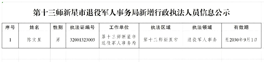 第十三师新星市退役军人事务局新增行政执法人员信息公示